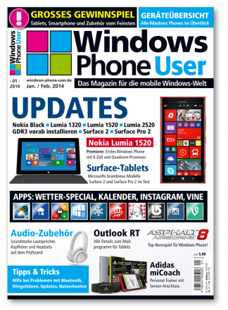 Windows Phone User 01/2014 kostet 5,90 Euro und ist im Handel und in unserem Online-Shop erhältlich. In letzterem finden Sie das Heft alternativ auch als PDF-Ausgabe oder als Mini-Abo mit zwei Ausgaben zum Preis von einer!